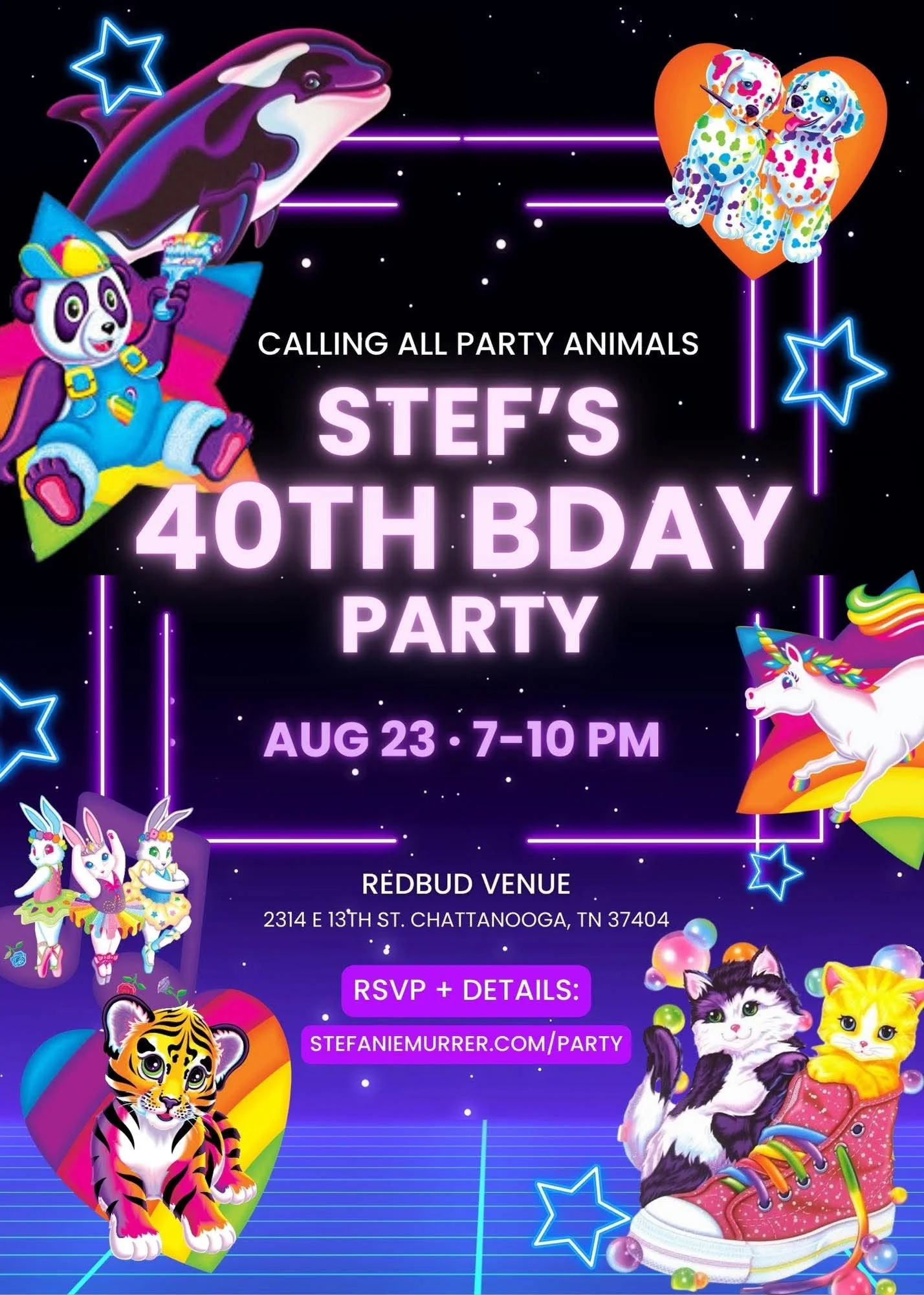 After going to a friend’s party, I realized that I couldn’t celebrate 40 years of life without a little dancing! And when I asked myself what sums up childhood nostalgia for me? LISA FRANK! And what 80’s baby doesn’t love a reason to dress up and do a theme? :) Feel free to wear all the things that are nostalgic for you. Bonus points for rainbow leopard print.